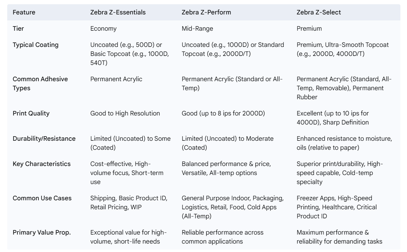 This table visually reinforces the tiered structure, highlighting how features like coating quality, adhesive options, print speed capability, and environmental resistance generally increase from Z-Essentials through Z-Perform to Z-Select, aligning with their respective value propositions.